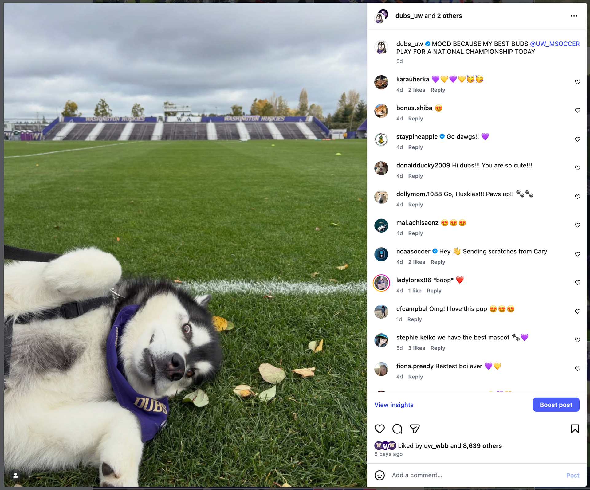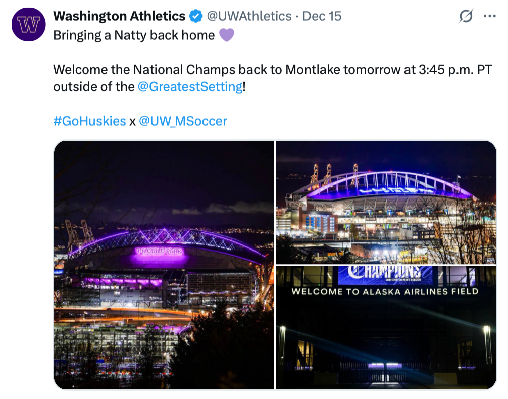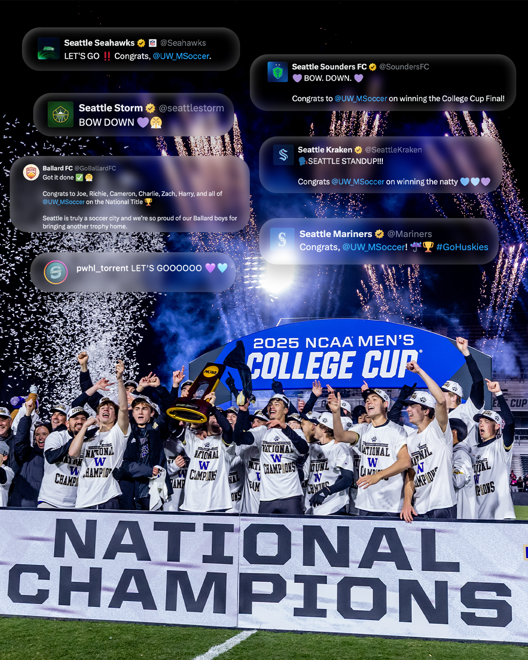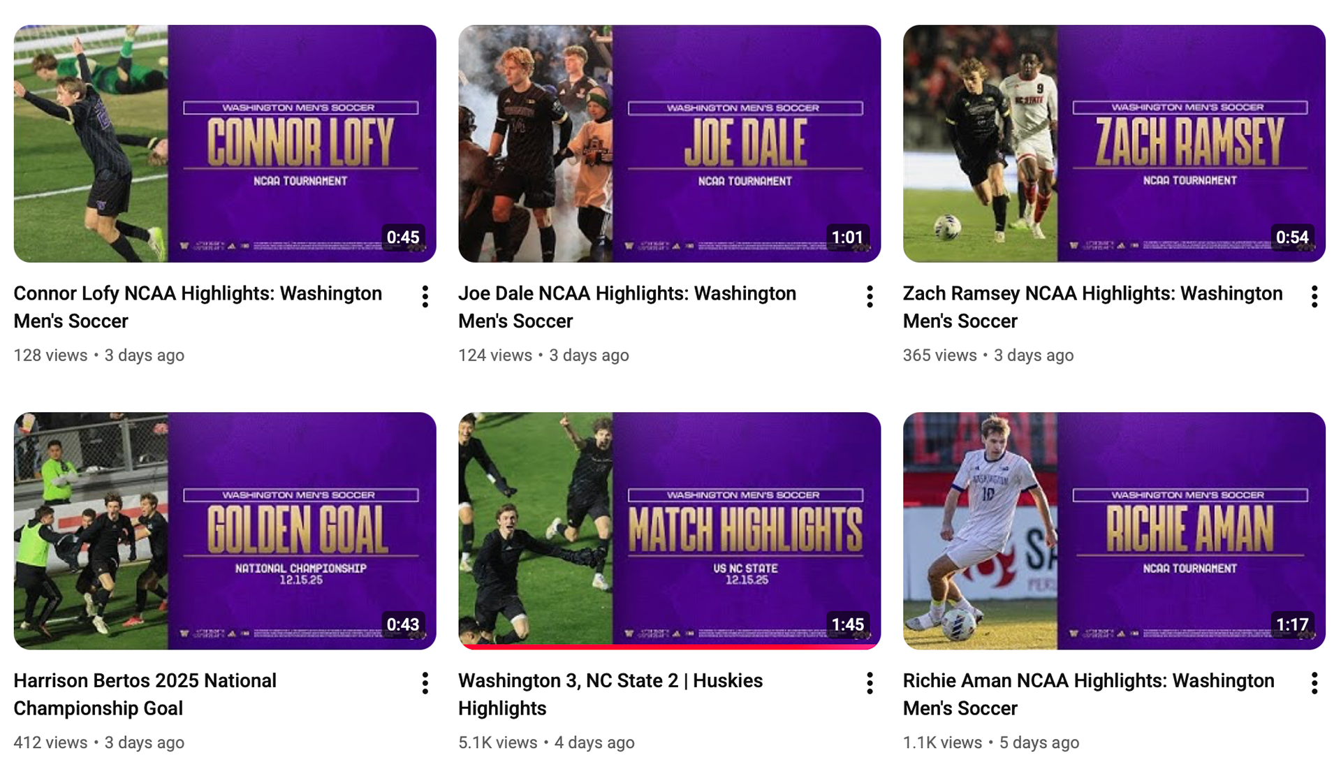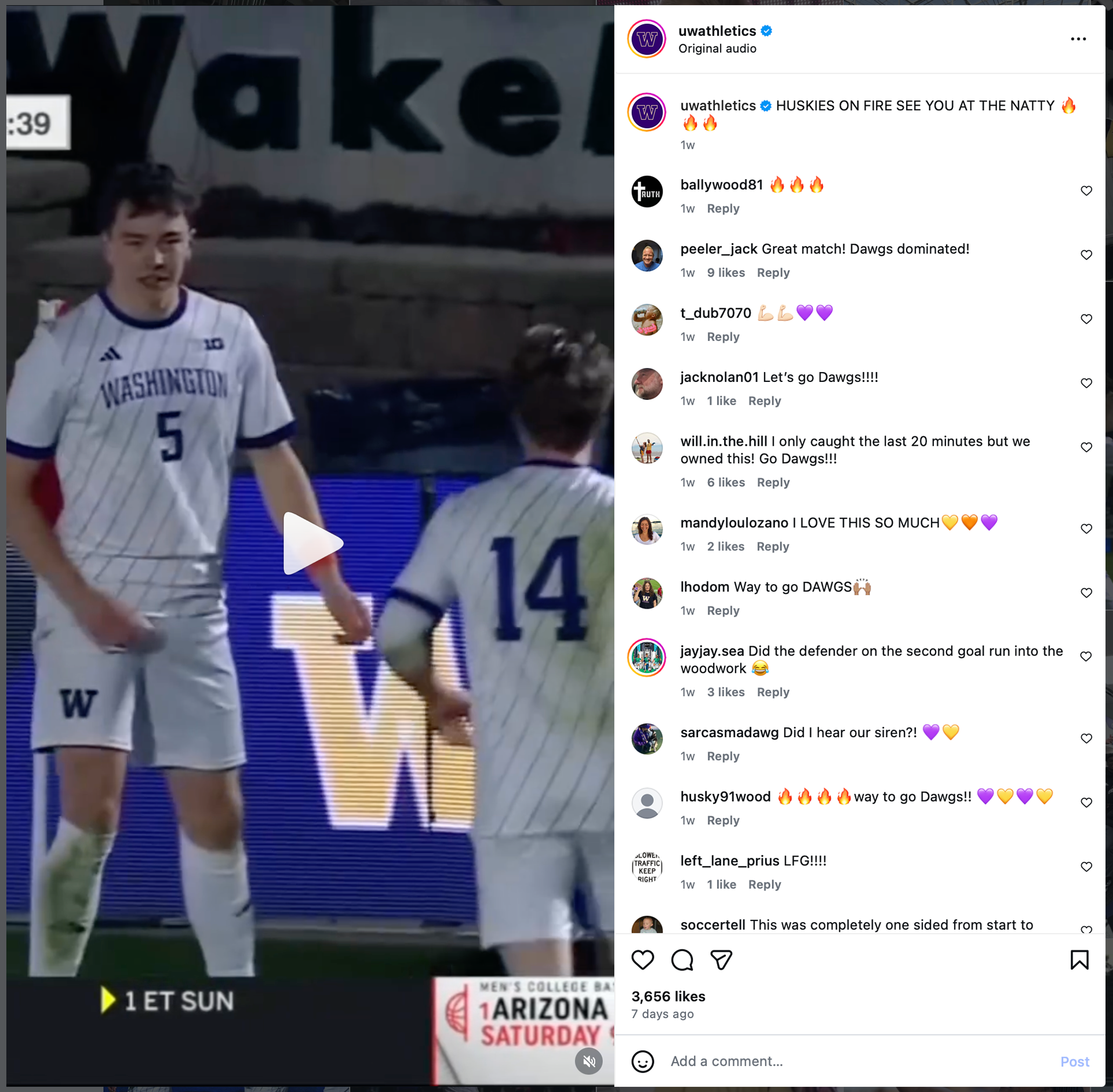 Event coverage spans all UW Athletics accounts, with content delivered across 22 sport programs. Leading a team of five digital strategy assistants, I oversee coverage from central department channels while coordinating closely with individual sport accounts. Content capture is central to this work, from documenting atmosphere and fan energy to telling the story of each game in real time. Coverage extends across social, the GoHuskies app, and web, ensuring a consistent voice for Husky Athletics while spotlighting the unique stories of every program.