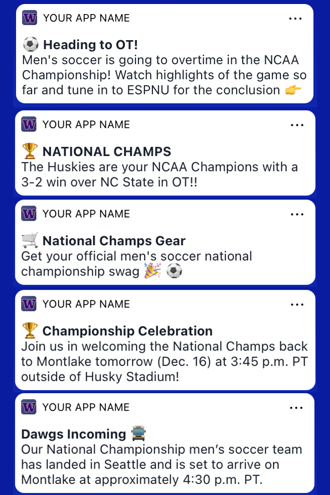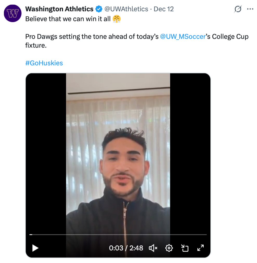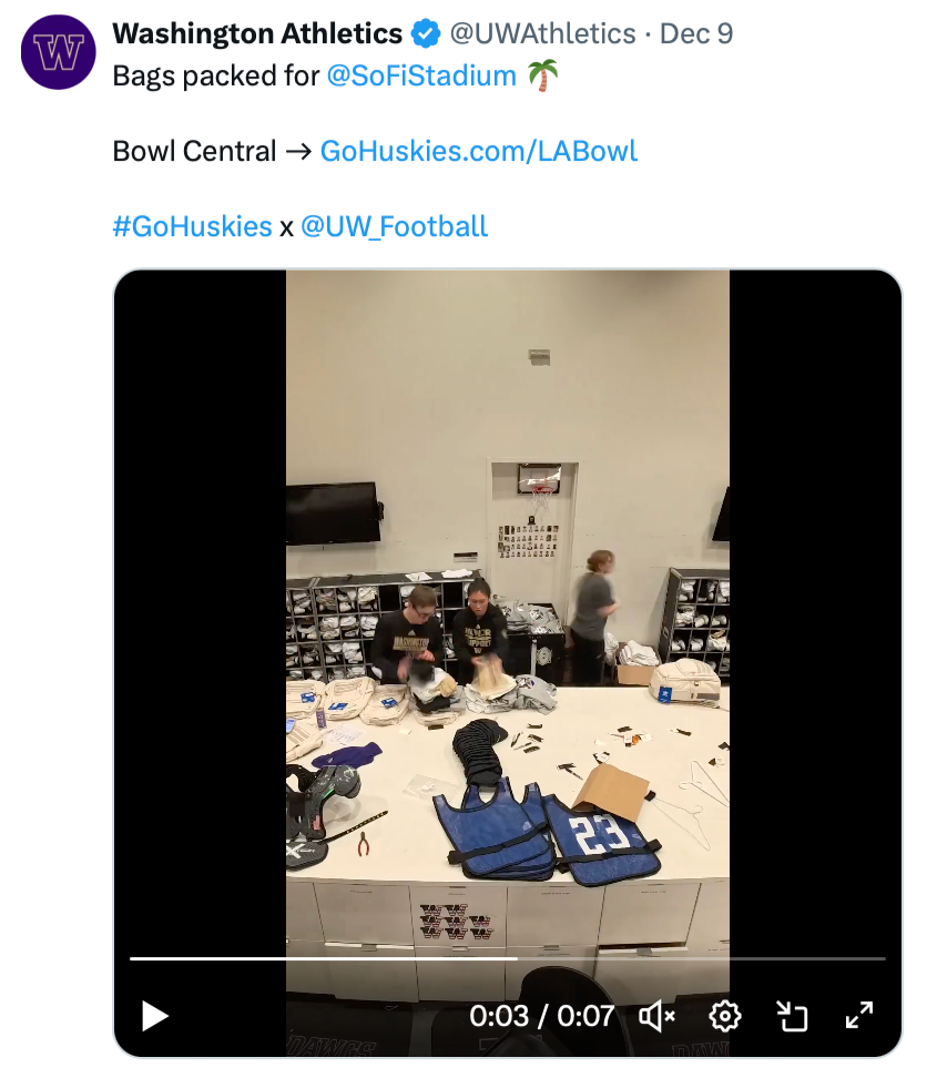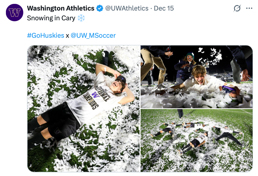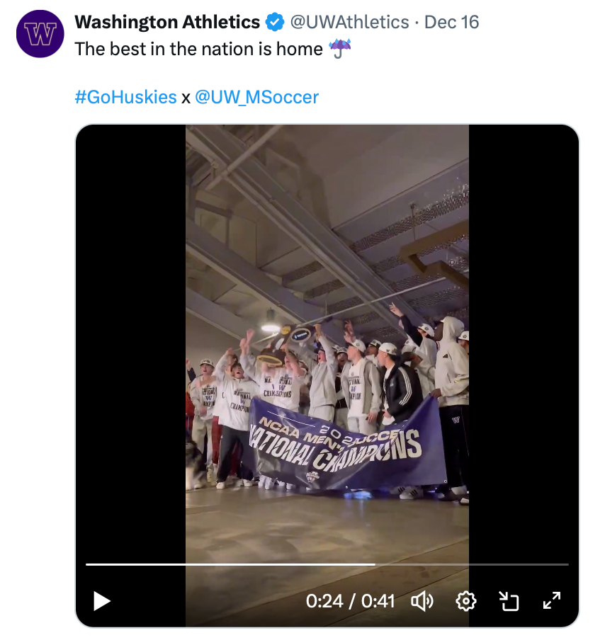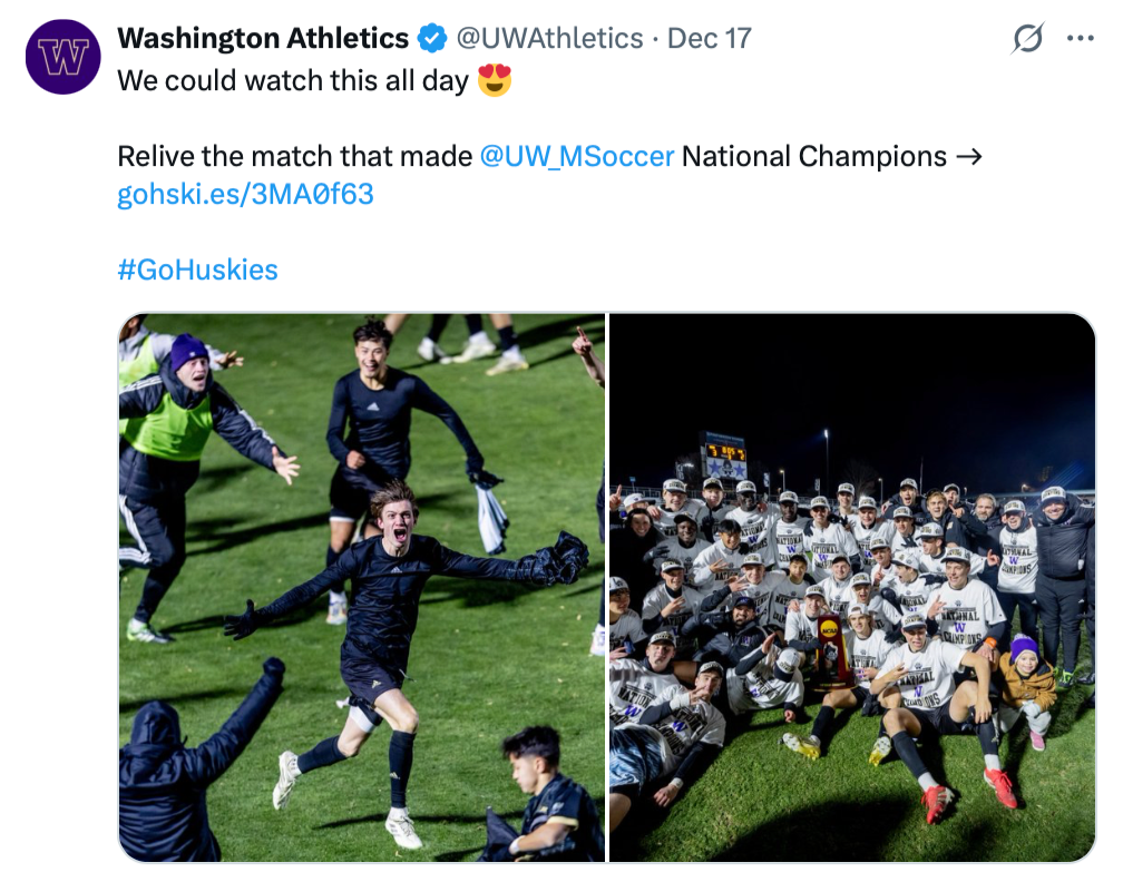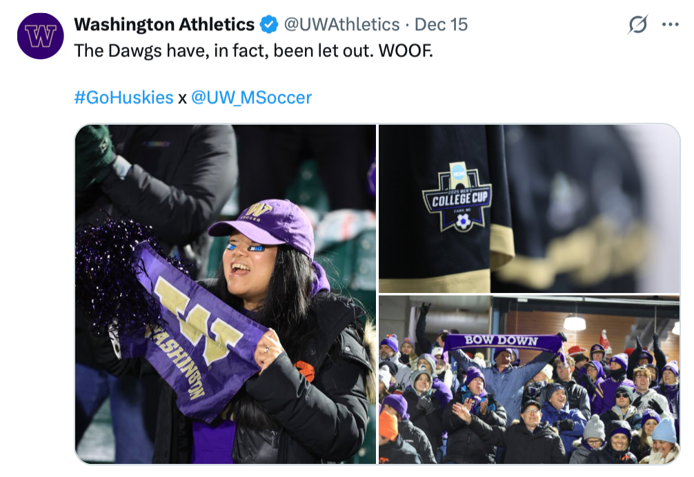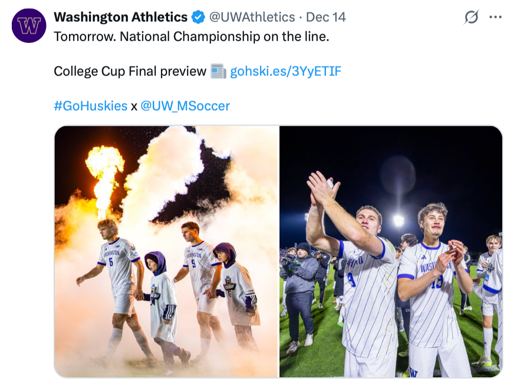 Event coverage spans all UW Athletics accounts, with content delivered across 22 sport programs. Leading a team of five digital strategy assistants, I oversee coverage from central department channels while coordinating closely with individual sport accounts. Content capture is central to this work, from documenting atmosphere and fan energy to telling the story of each game in real time. Coverage extends across social, the GoHuskies app, and web, ensuring a consistent voice for Husky Athletics while spotlighting the unique stories of every program.