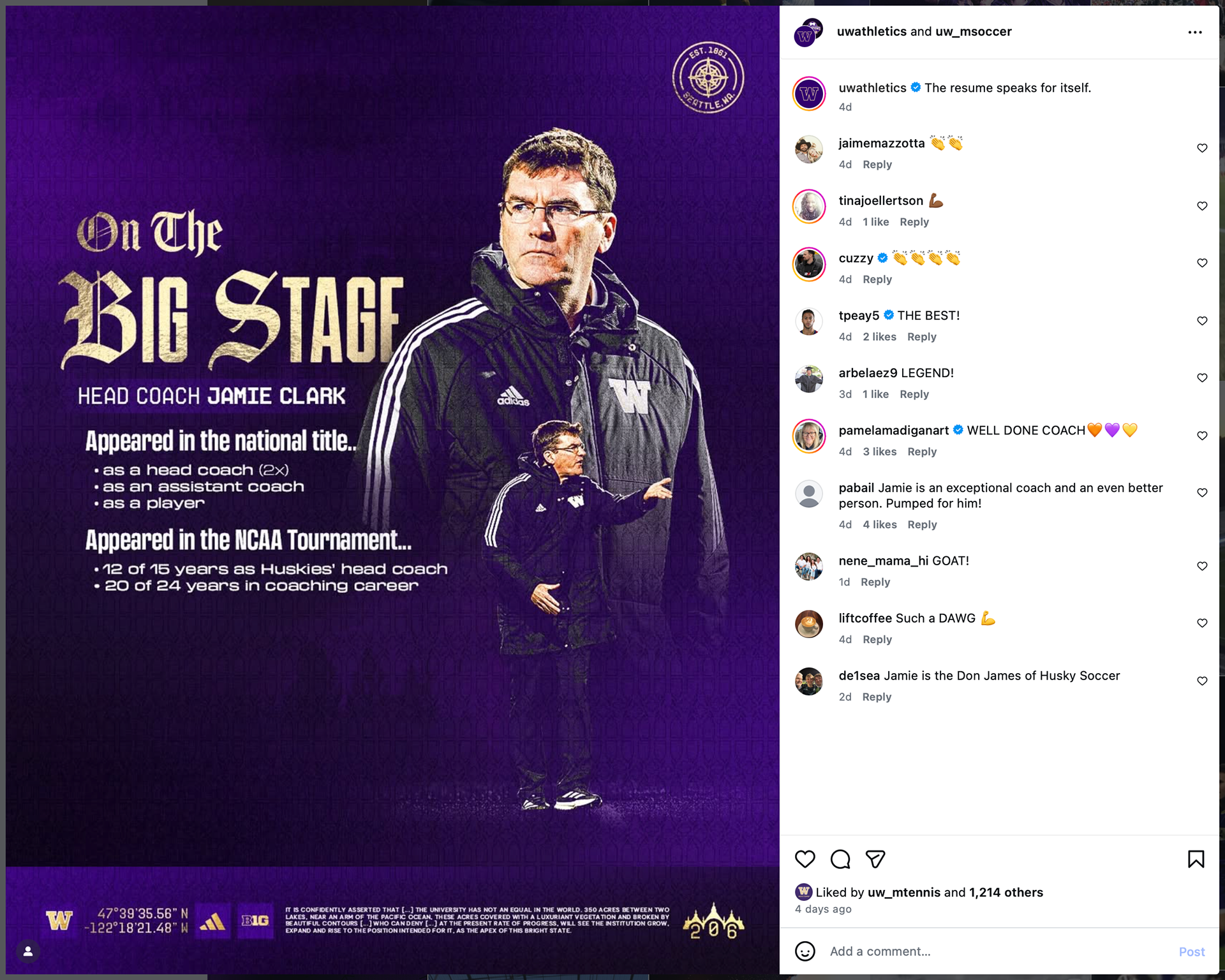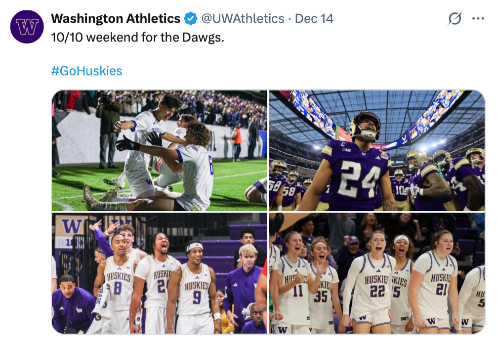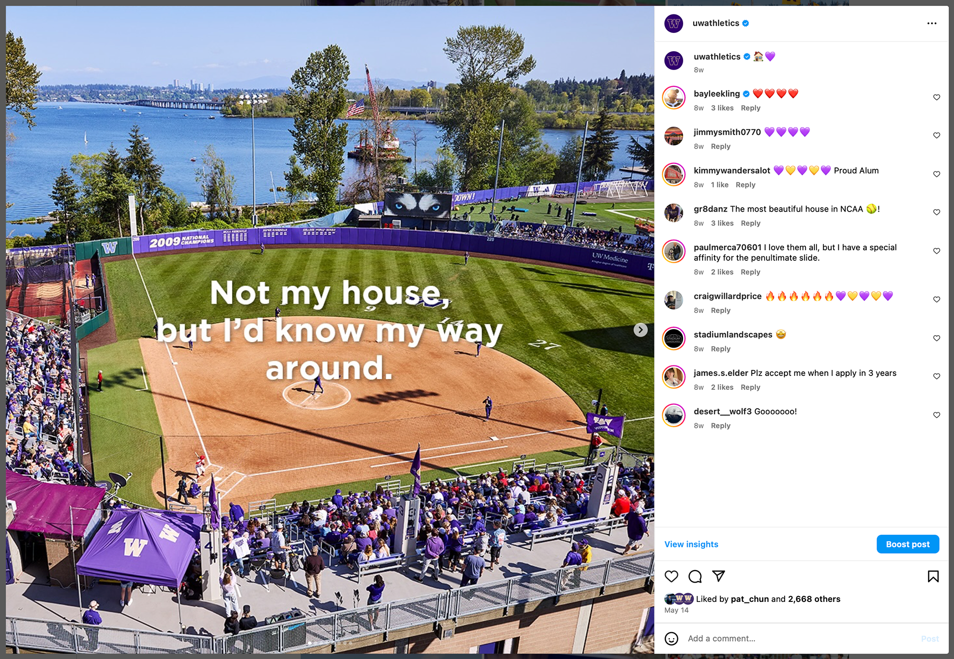 In 2025, during Washington’s first full year in the Big Ten Conference, @UWAthletics ranked second in the conference and top 10 nationally in engagement rate (4.01%) while producing 4,000+ organic posts. Since stepping into the role, I’ve helped reset UW Athletics’ digital strategy, driving a 769% increase in impressions within my first 90 days and generating 400M+ views/impressions and $9.27M in social value across athletics department channels.